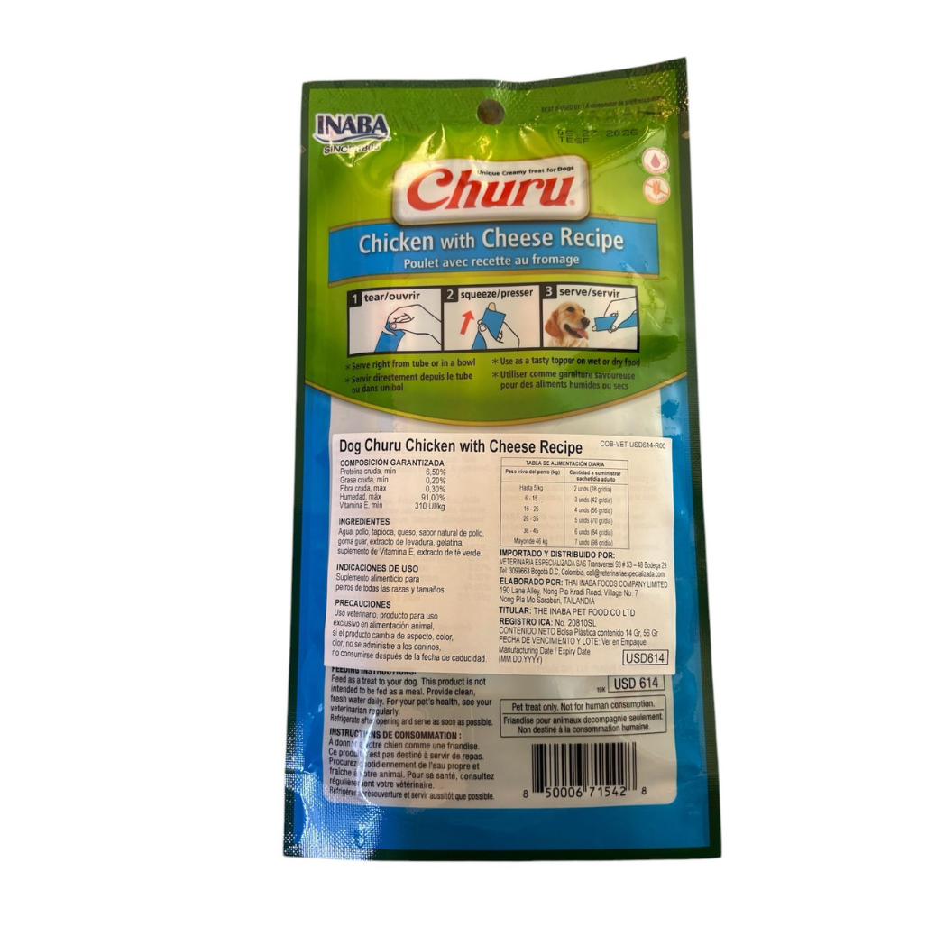 Snack cremoso para Perros Sabor Pollo y Queso (chicken With Cheese Recipe) x 4 Unidades elaborado con ingredientes de grado humano. Libre de granos, colorantes y preservantes artificiales. Fortalecido con Vitamina E y té verde.